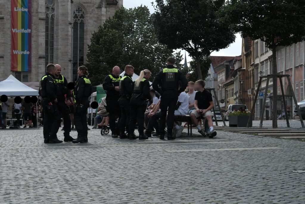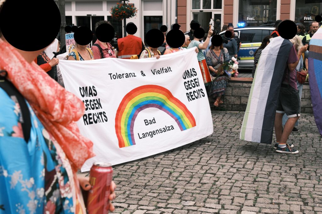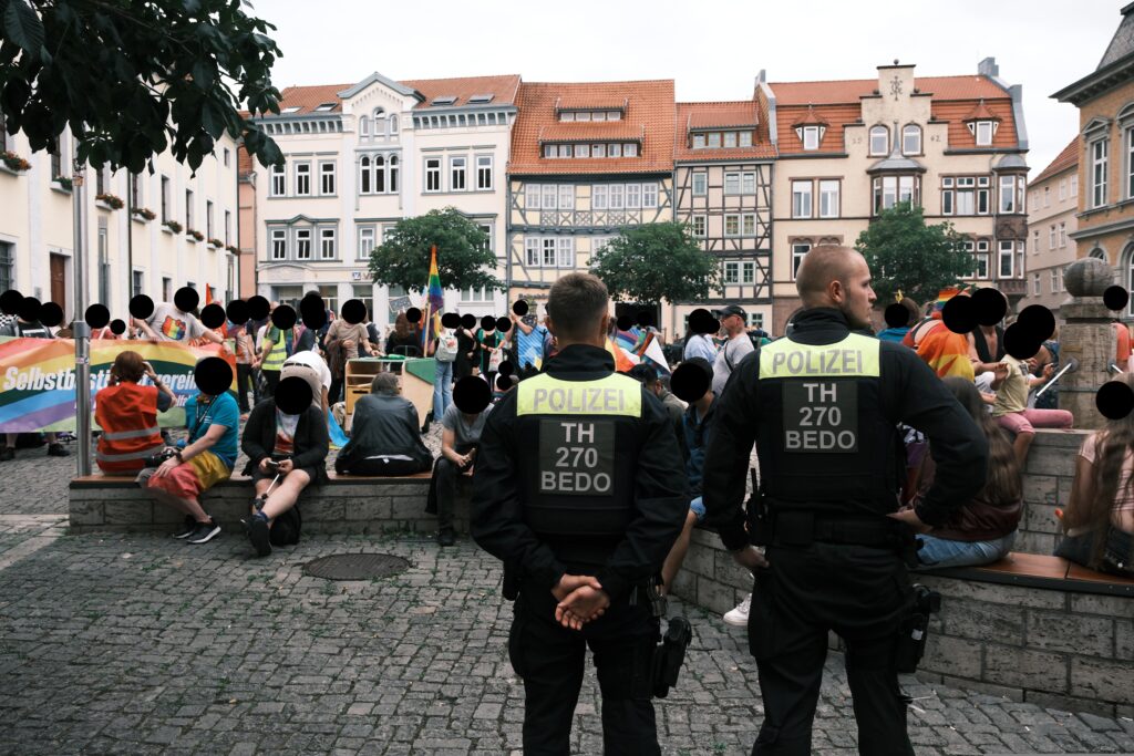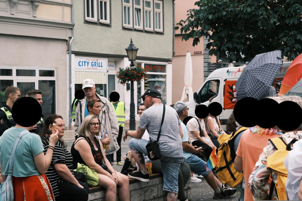Wenn auch die Faschos etwas lost, unkoordiniert und einfach nur dumm pöbelnd daherkamen, muss ihre ständige Präsenz dennoch als Drohszenario verstanden werden. Wir müssen außerdem festhalten, dass bisher auf jedem Thüringer CSD in diesem Jahr Faschos aufgetaucht sind. Addieren wir nur die „kleinen“ CSDs Pößneck, Nordhausen, Sonneberg und Mühlhausen zusammen, kommen wir auf bisher circa 100 Störer*innen in diesem Jahr. Kein CSD kann ohne Präsenz von Faschos stattfinden; gegen die Existenz und Präsenz queerer Menschen zu sein, scheint in einigen Bereichen der Gesellschaft völlig normal.