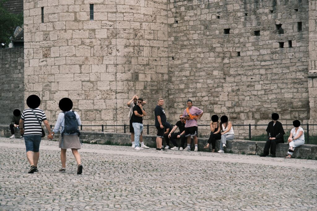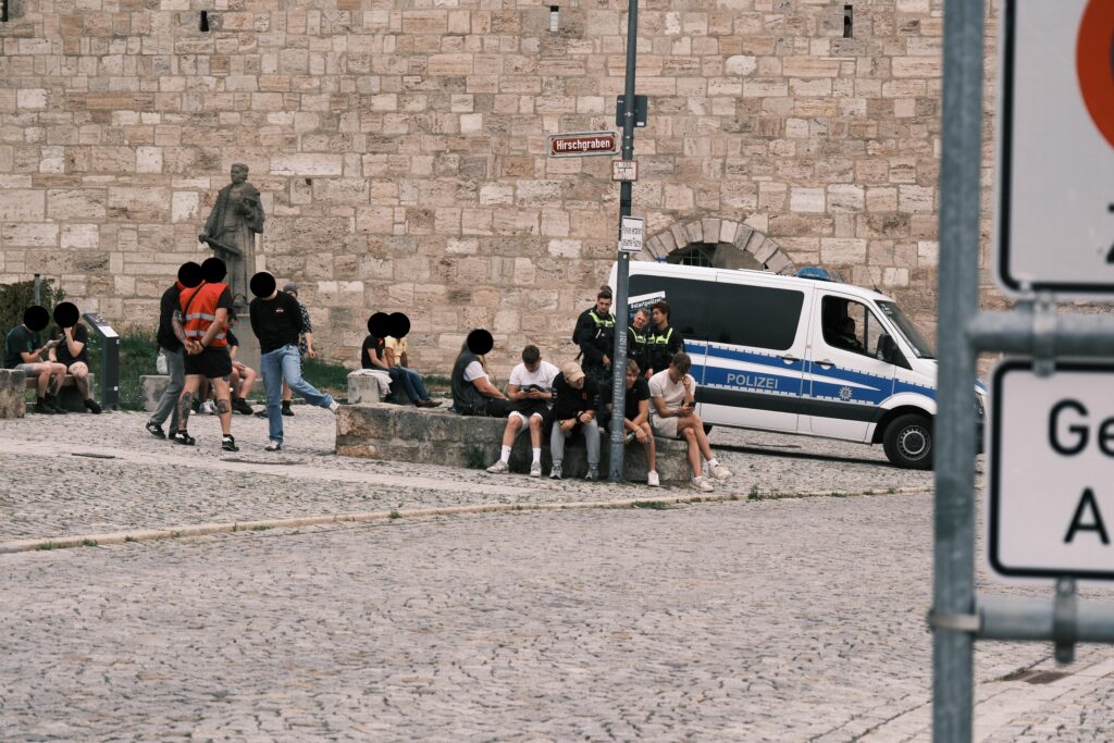 Eine kleine Gruppe Jungfaschos überholte den CSD mehrfach, setzte sich dann in unmittelbarer Nähe auf Bänke und gaffte die Demonstrant*innen an.